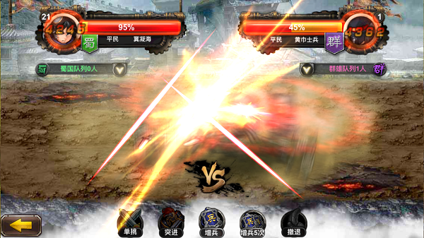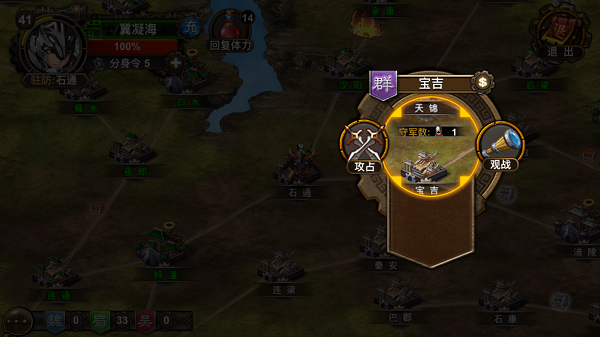 突破:当己方数量足够多时,可以突破敌军防线、直接进攻下一作城池。突破后玩家可攻打次城池相邻的敌方任意城池。
