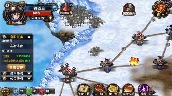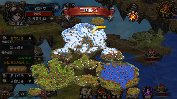 到达18级时开启“国战”玩法,点击界面右侧的国战按钮即可进入国战地图。国家阵营是在创建账号时选择的,后期不可更改。总共有255座城池分散在大地图上,分别被魏国(蓝色)、蜀国(绿色)和吴国(红色)的守卫军所把守,玩家的目标是攻占敌方城池并保护己方城池。